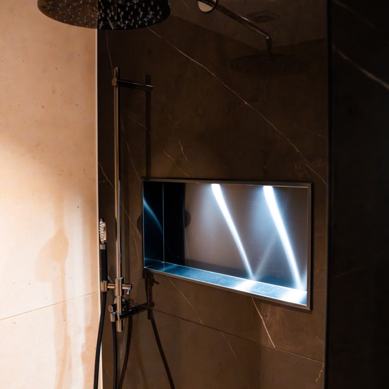 The new bathroom is finished with luxurious Porcelanosa tiles and premium fixtures from Hotbath. A timeless combination that effortlessly blends design with comfort. With meticulous attention to detail, we created a serene space where every day feels like a moment of luxury.